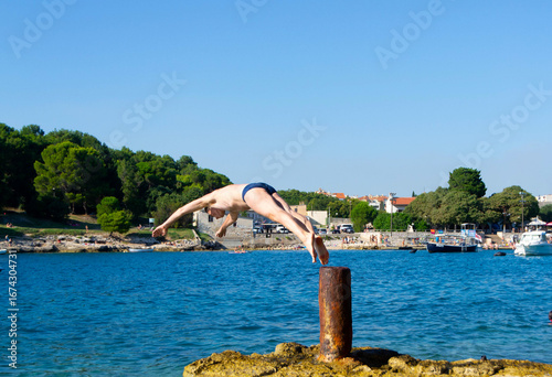 Man Jumping from Dock Bollard into the Adriatic Sea – Sequence of Summer Fun