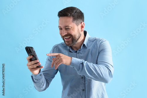 Man laughing while watching something on smartphone against light blue background