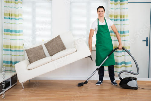 Man Lifting Couch While Cleaning Floor With Vacuum Cleaner
