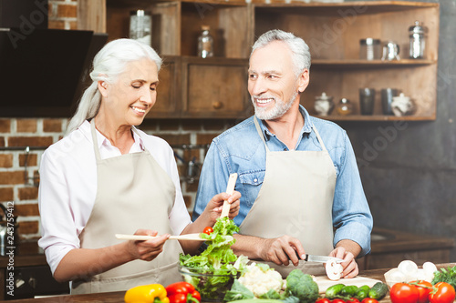adult, attractive, bearded, beverage, brick wall, caucasian, cook, cooking, couple, day, daylight, daytime, dinner, family, female, food, grey hair, photogenic, happy, healthy, home, husband, indoor, inside, interior, kitchen, leisure, lifestyle, male, man, morning, natural light, people, person, portrait, preparing, salad, senior, table, together, togetherness, two people, vegetable, wife, woman