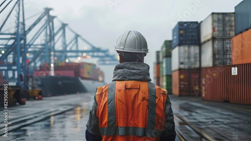 Man looks out over shipping yard.