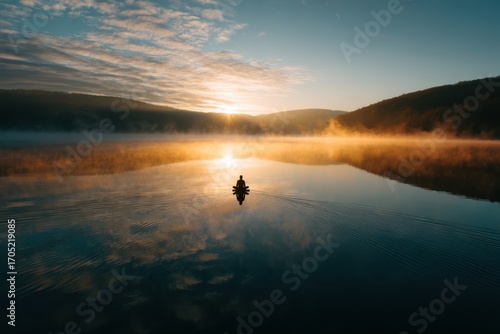 Man meditating in a calm lake at dawn, mindfulness and relaxation concept.