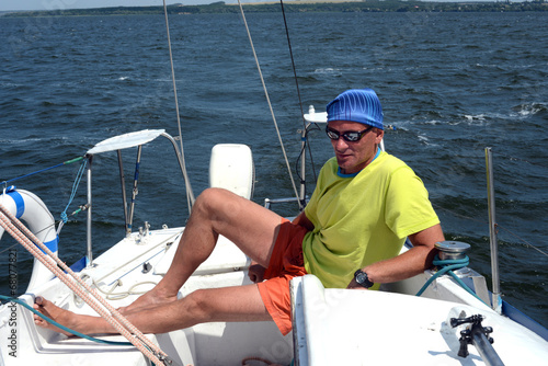 yacht, yachting, sail, sailing, recreation, leisure, adventure, travel, skipper, captain, sailor, man, only, portrait, unshaved, severe, adult, happy, joyful, freedom, vacation, joy, happiness, wind, speed, tackle, rigging, boat, horizontal, sky, blue, bright, caucasian, sunglasses, sunny, repair