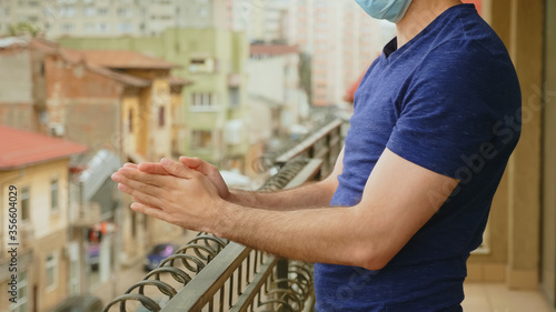 happy, balcony, man, medicals, support, staff, concept, fight, clap, corona, virus, epidemic, window, stay, infection, home, applause, person, nurse, health, city, hand, pandemic, house, disease, apartment, treatment, doctor, quarantine, hygiene, achievement, biology, congratulation, thank, disease, expressive, global
