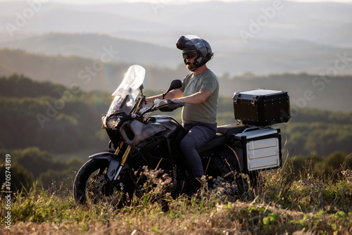 Man on his motorbike riding at sunset