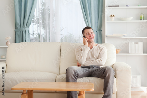 Man on the phone while sitting on his sofa