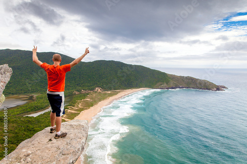 beach, atlantic, trek, standing, sitting, sea, sand, rock, ocean, mountain, man, hiking, guy, cloudy, cheering, cheer, brazil, brazil, boy, caucasian, white, male, person, people, adult, adult, 20s, grown-up