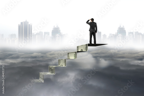 Man on top of money stairs looking at cityscape cloudscape