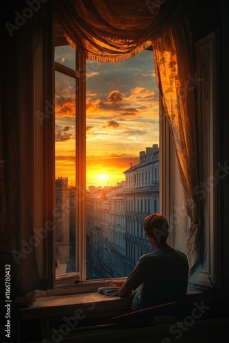 man, window, sill, sunset, evening, sky, cloud, landscape, scenic, view, relaxation, leisure, people, individual, alone, contemplation, thinking, reflecting, nature, scenery, beautiful, lovely, warm, gold, light
