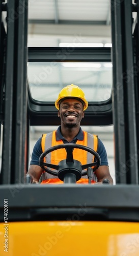 forklift, driver, warehouse, african, safety, helmet, vest, industrial, occupation, man, male, vehicle, machinery, machine, cargo, distribution, logistic, transportation, industry, construction, manufacturing, factory, storage, equipment, work, men at work, employee, engineer, mechanic, professional, skill, labor, job, career, business, hard hat, reflective, visibility, uniform, protective, transport, operator, freight, delivery, material