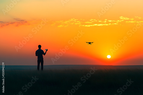 Man Piloting a Drone with a Remote, Framed by a Colorful Sunset