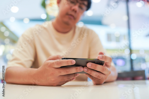 Man playing game on mobile phone. gamer boy playing video games holding Smartphone working mobile devices. cell telephone technology e-commerce concept