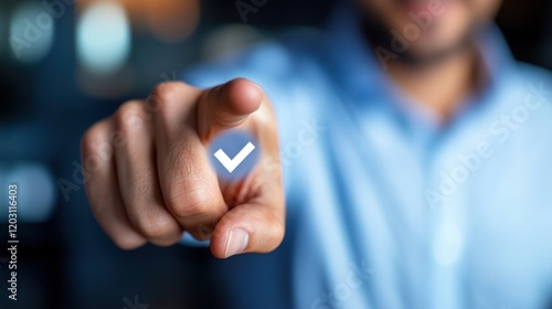 Man Pointing Finger at Check Mark Icon, Digital Selection, Confirmation, Approval, Choice, Decision, Technology Concept