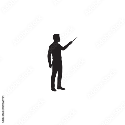 Man pointing with stick in silhouette style with dark monochrome color on white background for business presentation