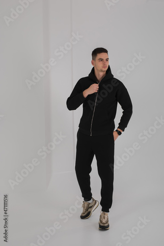 fashion, studio, hoodie, people, posing, stylish, man, model, full, length, wearing, clothes, trendy, fashionable, full body, black