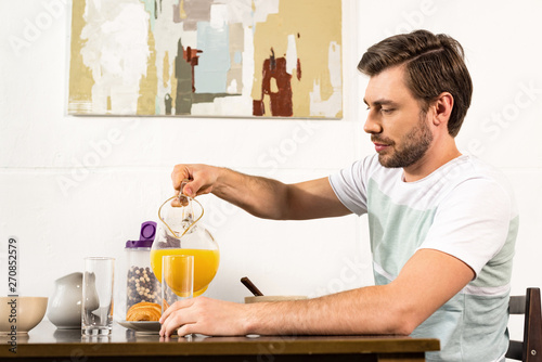table, adult, fresh, morning, caucasian, food, kitchen, pastry, plate, tasty, delicious, breakfast, chair, man, drink, croissant, beard, home, beverage, indoor, bakery, goggles, jug, bowl, bearded, one person, orange juice, milk pail