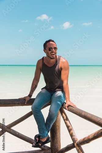 island, beach, blue, caribbean, connection, freedom, happiness, jean, latin, laugh, man, mexican, mindfulness, nature, outdoors, paradise, peaceful, pose, retreat, smiling, sunglasses, teacher, traveler, water
