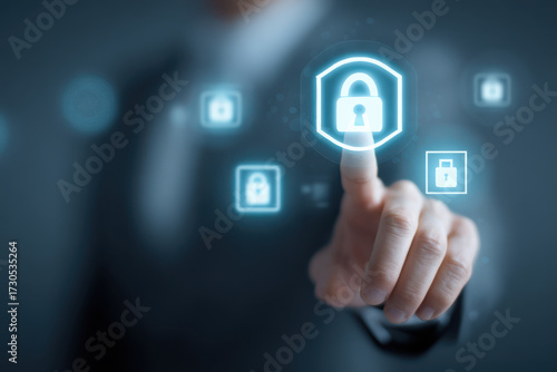 lock, security, graphic, digital, safety, protection, technology, datum, cyberspace, online, privacy, finger, press, man, adult, male, suit, business, businessman, network, system, information, code, shield, icon, interface, virtual, blue, glow, defense, safeguard, firewall, encryption, access, authorisation, control, connection, communication