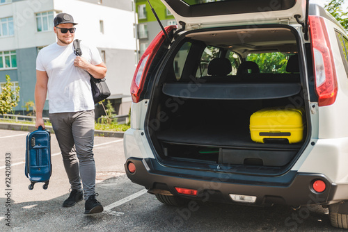 man, travel, car, bag, suitcase, preparation, trunk, one person, male, people, caucasian, european, stylish, lifestyle, beard, strong, summer, sunny day, stuff, clothes, thing, road, home, house, building, background, cap, hat, photogenic, smiling, face, happiness, cheerful, mood, morning, opened, put, hold, backpack, emotion, ready, sunglasses