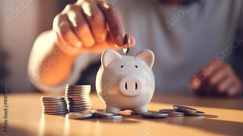 Man Putting Coins in a Piggy Bank - Savings and Financial Planning, personal finance, budgeting, saving money, financial growth, finance concepts,