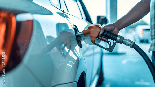 Man Refueling White Car at Petrol Station: Transportation Concept