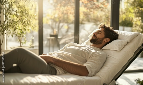 relaxation, nap, sleeping, rest, comfort, sunlight, window, interior, calm, peaceful, zen, white, green, tree, plant, beard, serene, chaise lounge, leisure, contentment, calmness, indoor, man, daylight, natural light, quiet, soft, skin, comfortable, laying
