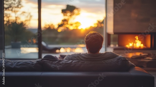 Man Relaxing On Couch In Front Of Fireplace And Sunset View