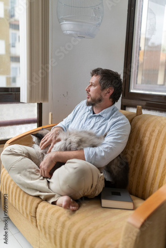 man, cat, sofa, window, looking, relaxing, contemplating, home, apartment, pet, animal, comfort, peace, calmness, lifestyle, domestic, interior, living room, furniture, book, reading, leisure, daydreaming, thoughtful, serene, quiet, alone, companionship, affection, love, care, bonding, cosy, casual attire