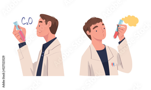 Man Scientist Character in White Coat Examining Something in Glass Flask Vector Set
