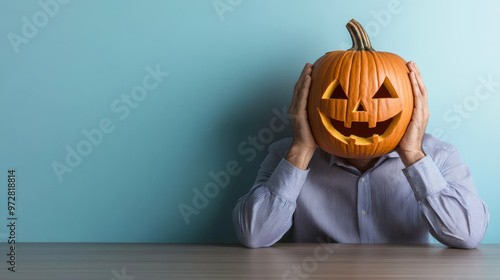 halloween, pumpkin, carved, costume, man, october, celebration, decoration, fall, festival, skittish, season, creativity, festive, orange, playful, indoor, casual attire, home, tabletop, cheerful, humorous, fun, autumn, holiday, spirit, hand, blue, background, joy, gathering, event, entertaining, traditional, cultural, party, smiling, whimsy, quirky
