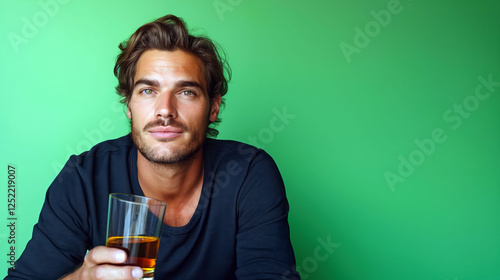 Man seated with whiskey glass revealing blank expression against a bright green background in a minimalist setup