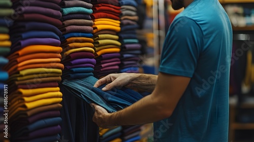 man, clothing, rack, shelf, colourful, apparel, selection, store, shopping, client, browsing, examining, choosing, purchase, display, stack, pile, textile, clothes, vibrant, colours, selecting, option, variety, garment, merchandise, retail, purchasing, blue, arm, hand