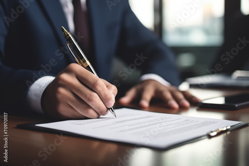 Man signing an official document. Close up businessman with pen in hands, ready signing paper, executive manager, Generated AI