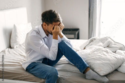 bed, man, sad, couple, home, bedchamber, sitting, sleepy, people, serious, night, cephalalgia, thinking, to sit, male, anxious, ill, alone, insomnia, photogenic, sleepy, loneliness, lifestyle, pain, head, bored, white, sick, silhouette, pajama, down, bad, face, side, look, ache, fatigue, grieved, apartment, regret, thinks, caucasian, sorrowful, problem, resting, stress, stressed, depressed, morning, arousing