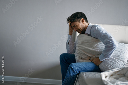 bed, man, sad, couple, home, bedchamber, sitting, sleepy, people, serious, night, cephalalgia, thinking, to sit, male, anxious, ill, alone, insomnia, photogenic, sleepy, loneliness, lifestyle, pain, head, bored, white, sick, silhouette, pajama, down, bad, face, side, look, ache, fatigue, grieved, apartment, regret, thinks, caucasian, sorrowful, problem, resting, stress, stressed, depressed, morning, arousing