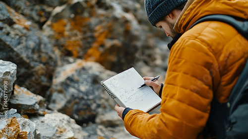 man, sketching, notebook, rock, writing, drawing, yellow jacket, beanie, backpack, nature, landscape, activity, creativity, art, hiking, exploration