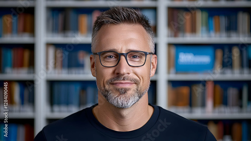 man, smiling, library, book, background, portrait, adult, male, face, goggles, cognition, wisdom, learning, education, reading, scholar, student, prof, teacher, research, intelligence, study, bookshelf, literature, intellectual, thinking, serious, happy, calm, confident, experienced, mature, person, human, portraiture, image, photo, picture, head shot, professional, success, idea