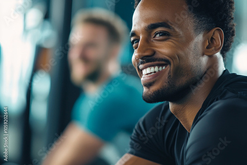 Man smiling during workout at gym with friend nearby