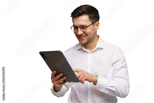 man, tablet, smiling, technology, engagement, modern, interaction, joy, bright, setting, casual attire, device, screen, finger, sharpened, communication, content, user, happiness, lifestyle, hand, white shirt, goggles, contemporary, digital, professional, business, online, presentation, information, exploring, browsing, social, connection, work, productivity, innovation, entertainment, fun, leisure, people, tech