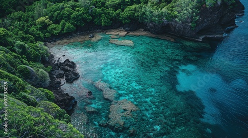 aerial, lagoon, tropical, turquoise, snorkeling, man, vegetation, green, lush, ocean, sea, water, nature, travel, summer, vacation, paradise, island, coast, coastline, scenery, landscape, exotic, destination, blue, clear, sunny, coral, reef, rock, cliff, drone, view, top