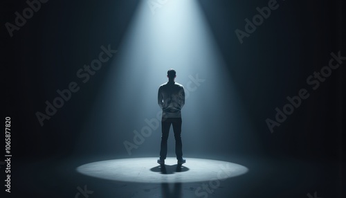 Man standing alone in spotlight with dramatic lighting in dark room