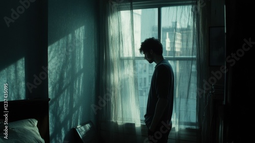 man, window, room, light, shadow, silhouette, dark, moody, atmospheric, pensive, thoughtful, lonely, solitude, sorrowful, depression, melancholy, contemplation, introspection, quiet, calm, serene, peaceful, still, urban, city, building, apartment, interior, home, house, alone, person, male, young, adult, portrait, photo, image, picture, art, aesthetic, vibe, feeling, emotion, green, teal, blue, grey