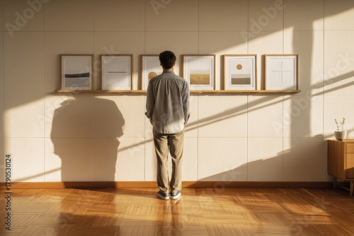 man, standing, room, sunlight, picture, frame, shelf, adjusting, calm, atmosphere, obsessive, disorder, meticulous, interior, design, home, decor, shadow, wooden, floor, bright, space, sharpened, detail, organisation, art, gallery, behaviour, mental, health, serenity, light, texture, clean, order, arrangement, lifestyle, calmness, simplicity, warmth, ambience, creativity, visual