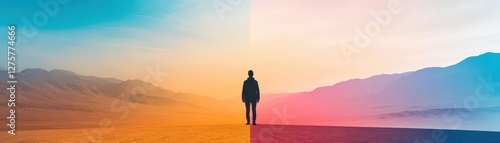 Man standing in desert landscape with mountains in background under clear blue sky