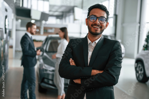 Man standing in front of his coworkers. Three people are working together in the car showroom