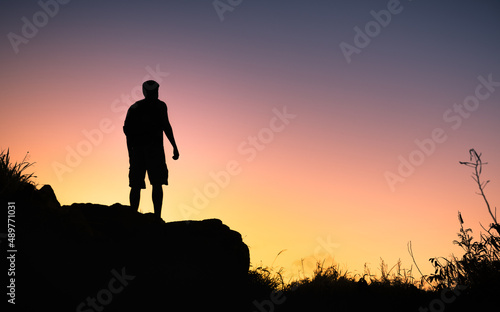 Man standing on a mountain facing the sunrise