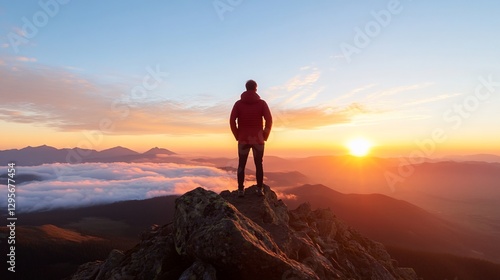 mountain, sunrise, man, peak, cloud, sunset, landscape, nature, travel, adventure, hiking, trekking, sky, view, scenic, inspiration, success, freedom, achievement, motivation, summit, climb, top, explore, journey, wanderlust, solitude, peace, calmness, horizon, dawn, dusk, light, shadow, silhouette, vale, ridge, range, wilderness, wild, rock, stone, cliff, height, altitude, panorama, beautiful