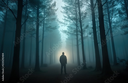 Man stands in foggy forest. Dense trees surround him. Soft light shines ahead. Mysterious, tranquil atmosphere. Isolated figure in woods. Misty woodland scene. Lonely, quiet place. Dark, peaceful.