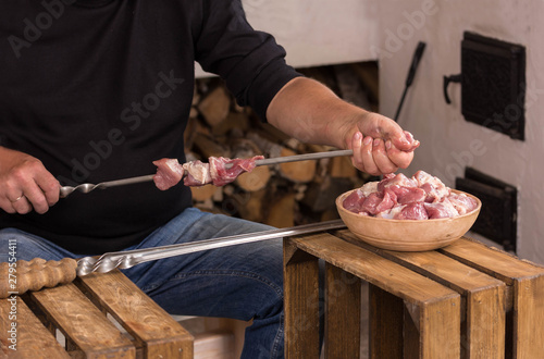 Man strings pieces of raw meat on a skewer. Skewers lie on wooden boxes. Against the background of the furnace and firewood. Horizontal