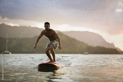 man, mid, adult, caucasian, sea, water, ripple, surfboard, racked, surfing, adventure, leisure, lifestyle, balance, vacation, nature, sky, cloud, shirtless, wet, topless, short, front, mountain, full-length, alone, 1, people, outdoors, day